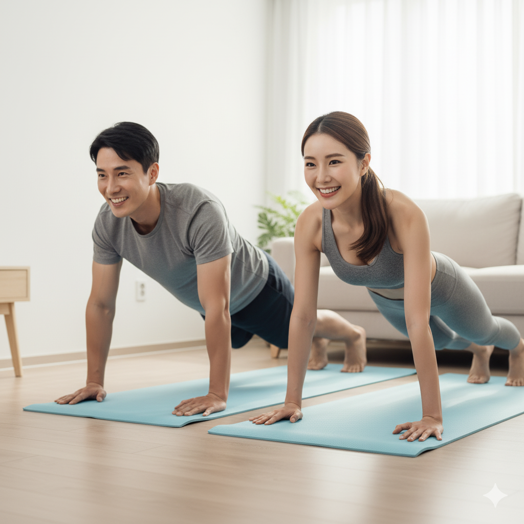 - 초보자 Tip: 근력이 부족하다면 무릎을 바닥에 대고 하는 '니 푸시업(Knee Push-up)'으로 시작하거나, 벽을 짚고 하는 '월 푸시업(Wall Push-up)'으로 난이도를 조절하세요.
